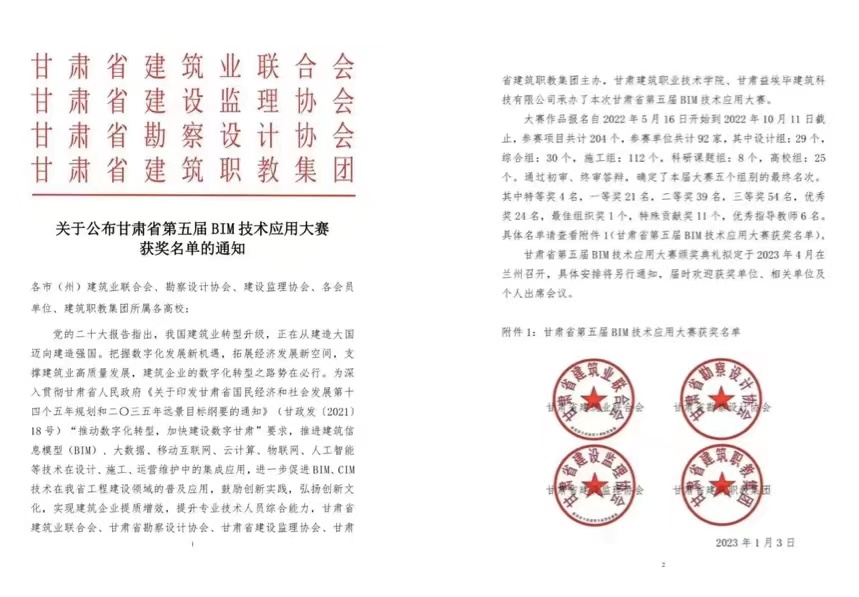 日前,甘肅省第五屆BIM技術(shù)應(yīng)用大賽結(jié)果公布,甘肅工程咨詢集團(tuán)共獲得14個獎項(xiàng),其中,“BIM技術(shù)在東鄉(xiāng)縣沿洮河經(jīng)濟(jì)帶棚戶區(qū)改造二期(調(diào)整)項(xiàng)目設(shè)計(jì)階段的應(yīng)用”等8個項(xiàng)目分別獲設(shè)計(jì)組一、二、三等獎,“同心抗疫,智慧建造—甘肅省疾病預(yù)防控制中心公共衛(wèi)生中心項(xiàng)目BIM綜合應(yīng)用”等3個項(xiàng)目分別獲綜合組特等獎及一、二等獎,“數(shù)字化轉(zhuǎn)型背景下的勘察設(shè)計(jì)企業(yè)BIM技術(shù)推廣路徑探究”等2個項(xiàng)目分別獲科研課題組二、三等獎,建筑設(shè)計(jì)院獲特殊貢獻(xiàn)獎。