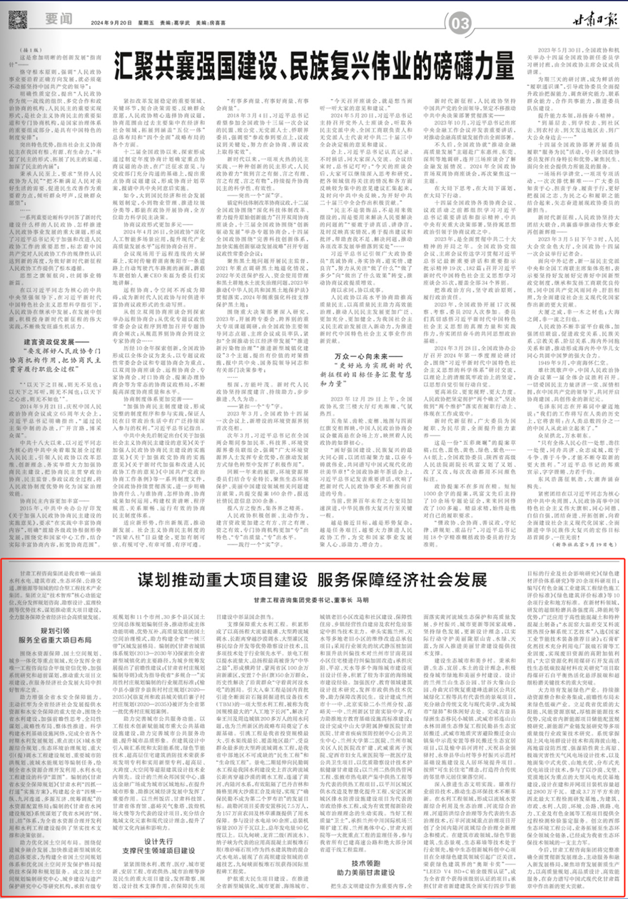 今后,甘肅工程咨詢集團(tuán)將完整準(zhǔn)確全面貫徹新發(fā)展理念,主動服務(wù)和融入新發(fā)展格局,聚焦培育發(fā)展新質(zhì)生產(chǎn)力,以高質(zhì)量規(guī)劃、高品質(zhì)設(shè)計(jì)、高效能服務(wù),在奮力譜寫中國式現(xiàn)代化甘肅篇章中作出新的更大貢獻(xiàn)。