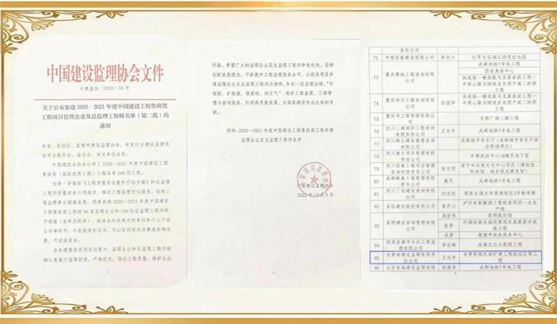 項目榮獲中國建設(shè)工程魯班獎,項目總監(jiān)理工程師榮獲“先進(jìn)個人”榮譽(yù)稱號