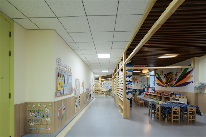設(shè)計團隊秉承“文化根系·生態(tài)課堂”的核心理念,實現(xiàn)了三大創(chuàng)新突破:文化傳承創(chuàng)新,巧妙解構(gòu)傳統(tǒng)藏式建筑語匯,以象征性的“煨桑臺”形態(tài)塑造入口空間,并運用夯土墻、木質(zhì)格柵等本土材料與工藝,喚醒地域文化記憶。生態(tài)教育融合,充分利用場地自然高差,構(gòu)建多層級生態(tài)活動圈。設(shè)置屋頂農(nóng)場、戲水溪谷、觀星臺等多元互動空間,鋪設(shè)出一條“從土壤到星空”的自然認(rèn)知與探索路徑。兒童友好設(shè)計,深度契合3-6歲兒童行為特征,引入模塊化家具系統(tǒng),并融入光影劇場、交互藝術(shù)墻等智慧化設(shè)施,充分激發(fā)幼兒的好奇心、探索精神與創(chuàng)造力。
