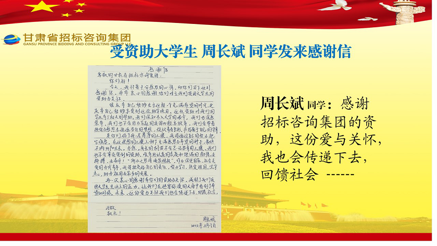 近日,張家川縣張棉驛鄉(xiāng)張棉村貧困大學(xué)生代表劉國熙、周長斌、李雪峰等向甘肅省招標(biāo)咨詢集團(tuán)有限責(zé)任公司發(fā)來感謝信,就招標(biāo)咨詢集團(tuán)給予學(xué)費(fèi)資助一事表達(dá)他們的感激之情。