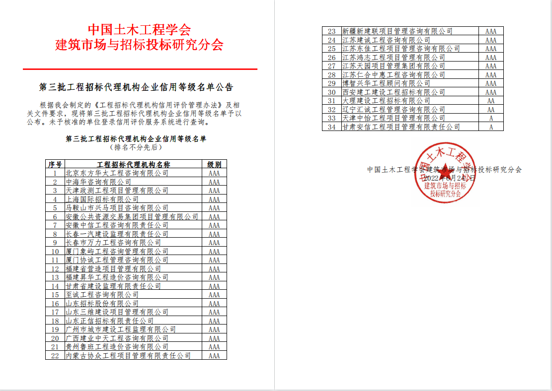 為認(rèn)真貫徹落實(shí)甘肅省第十四次黨代會(huì)精神,更好地發(fā)展招標(biāo)代理業(yè)務(wù),努力推進(jìn)企業(yè)高質(zhì)量發(fā)展,2022年6月,甘肅省建設(shè)監(jiān)理有限責(zé)任公司積極籌備參加了由中國(guó)土木工程學(xué)會(huì)建筑市場(chǎng)與招投標(biāo)研究分會(huì)組織的招標(biāo)代理機(jī)構(gòu)信用評(píng)價(jià),日前,第三批工程招標(biāo)代理機(jī)構(gòu)企業(yè)信用等級(jí)名單公布,建設(shè)監(jiān)理公司榮獲中國(guó)土木工程學(xué)會(huì)建筑市場(chǎng)與招標(biāo)投標(biāo)研究分會(huì)招標(biāo)代理機(jī)構(gòu)AAA級(jí)信用企業(yè)稱號(hào)。