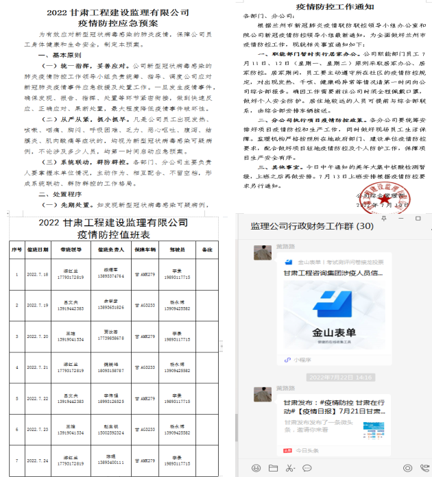 面對疫情“大考”,甘肅建筑設(shè)計院以高度的責任感守護疫情防控的“省院”防線,在阻擊疫情方面,堅持聞令而動、令行禁止,做好自身防護的同時,選派干部響應(yīng)號召下沉街道,派出志愿者助力轄區(qū)防控,把省市的各項防控舉措落實落細落到位;在生產(chǎn)經(jīng)營方面,發(fā)揮科技企業(yè)優(yōu)勢,統(tǒng)籌把握疫情防控與重點工程服務(wù)保障的關(guān)系,做到勘察服務(wù)準時高效、外業(yè)作業(yè)安全有序,把損失降到最低。建筑設(shè)計院各生產(chǎn)單位扭住關(guān)鍵點、打好主動戰(zhàn),用一項項“硬核”舉措實現(xiàn)“自救”解困。瞧!這里就有一份來自建筑設(shè)計院子公司監(jiān)理公司的“戰(zhàn)報”。