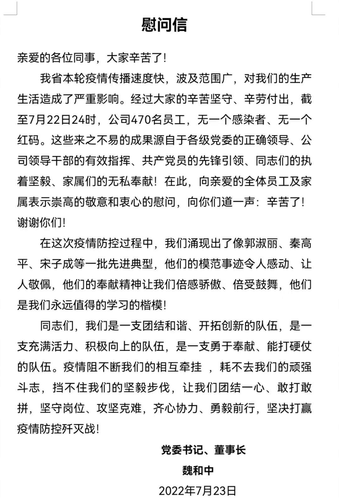 近日,甘肅省建設(shè)監(jiān)理有限責(zé)任公司黨委書記、董事長魏和中向全體職工發(fā)出慰問信,對在疫情期間值守項目一線和抗戰(zhàn)疫情一線的黨員干部職工致以最誠摯的關(guān)心和感謝。同時,號召全體干部職工向疫情防控期間涌現(xiàn)出的一線先進(jìn)典型個人和共產(chǎn)黨員先鋒者學(xué)習(xí),團(tuán)結(jié)一心、敢打敢拼,堅守崗位、攻堅克難,齊心協(xié)力、勇毅前行,堅決打贏疫情防控殲滅戰(zhàn)。