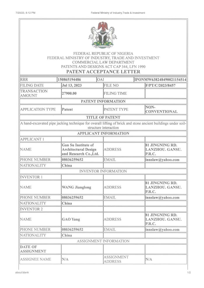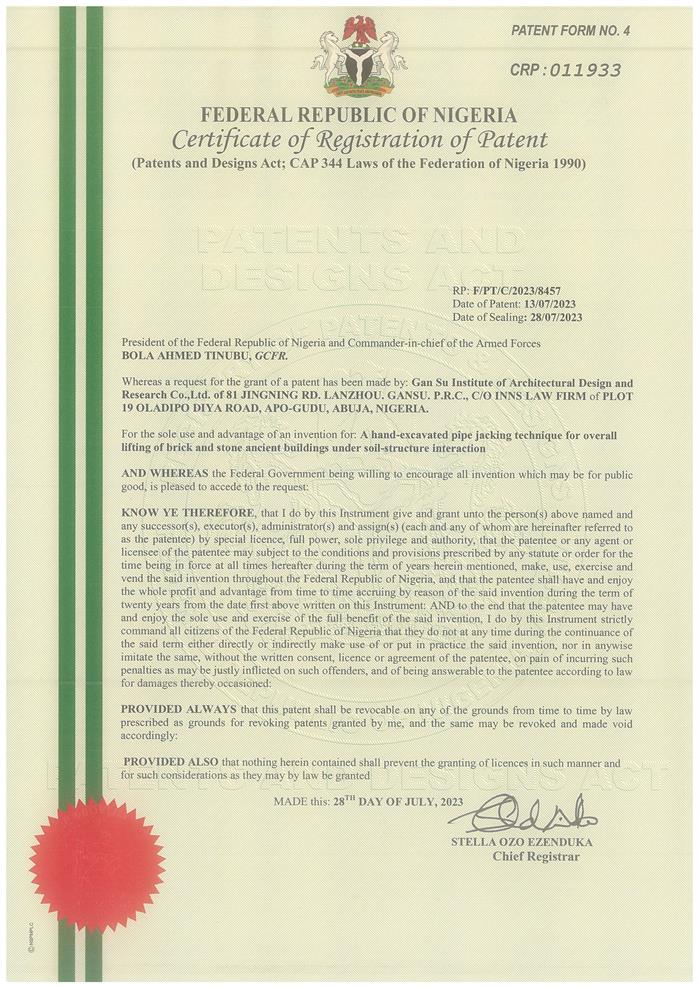 日前,非盟知識產權局對省建筑設計院王江龍等申報的“土-結構相互作用下磚石結構古建筑整體頂升手掘式頂管技術”(A hand-excavated pipe jacking technique for overall lifting of brick and stone ancient buildings under soil-structure interaction)進行授權,為省建筑設計院后續(xù)承接援外項目及國外項目給予了堅實的技術支撐。